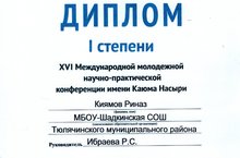 Ученик 11 класс Киямов Риназ участвовал в XVI международной молодежной научно - практической конференции имени Каюма Насыри и был удостоен диплому первой степени