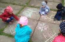 В Старозюринском детском саду прогулки на свежем воздухе проходят интересно и увлекательно. Вот и сегодня с детьми воспитатели организовали рисование цветными мелками на асфальте. Рисование на асфальте – это не только веселое занятие во время прогулки. Это и творчество, и познание ребенком окружающего мира. Рисуя мелками ,у детей активизируется умственная деятельность, расширяется кругозор, воспитывается художественный вкус и чувство гармонии, цвета и ритма. Детская фантазия огромна и многообразна. В своих рисунках они изобразили: солнышку, радугу, цветы. Рисунки у всех получились очень красивые.