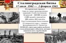 Сталинградская битва — одно из важнейших и крупнейших генеральных сражений Второй мировой и Великой Отечественной войн между Красной армией и вермахтом, поддерживаемым армиями стран «оси». Проходила с 17 июля 1942 года по 2 февраля 1943 года на территории современных Воронежской, Ростовской, Волгоградской областей и Республики Калмыкия.Цель была одна — отстоять Сталинград (ныне Волгоград) и разгромить действовавшую на этом направлении группировку вражеских войск и она была достигнута. В Малокибякозинской школе прошли мероприятия,приуроченные к этой дате.Были организованы просмотры видеороликов и презентаций.
