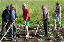 В пришкольном участке Максабашской начальной школы работа не прекращается. Работники школы трудятся в пришкольном участке.