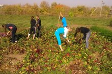 Сегодня ученики Верхнекибякозинской средней школы радостно собирали осенний урожай .Это результат нашей плодотворной работы . Ученики собирали урожай свеклы, моркови, капусты . Солнце греет по- летнему работается здорово,весело!