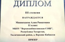 15го апреля в Казанском федеральном университете (КФУ) прошла торжественная церемония награждения победителей и призеров Межрегиональных предметных олимпиад КФУ. Среди призеров есть и ученица 11 класса Верхнекибякозинской средней школы Миннекаева Алия Ринатовна. Ее руководитель – Хасаншина Зубарджат Рахимзяновна. Алия Миннекаева награждена Дипломом III степени межрегиональной предметной олимпиады КФУ по дисциплине «Татарский язык».