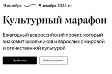 С 31 октября по 9 декабря 2022 года в онлайн-формате реализуется проект «Культурный марафон». В этом году марафон состоится в четвертый раз и будет посвящен истории моды и роли технологий в ее развитии. Принять участие в «Культурном марафоне» могут все желающие, как взрослые, так и дети, пройдя тест на официальном сайте проекта: https://education.yandex.ru/culture/