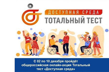 Уважаемые родители, учителя и ученики, просим всех поддержать акцию Тотальный тест «Доступная среда». Формат проведения акции - онлайн. Участники проходят Тотальный тест «Доступная среда» дистанционно с любого персонального устройства с доступом в интернет с 2 по 10 декабря 2022г.