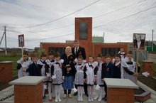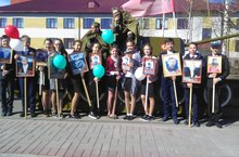 Укучылар, укытучылар чәчәкләр, шарлар, бабаларының, авылдашларыбызның фотоларын тотып "Үлемсез полк" акциясендә катнаштылар.