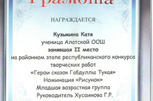 Ученица 1 класса Кузьмина Катя участвовала в районном этапе республиканского конкурса рисунков, посященных героям сказок Габдуллы Тукая и заняла достойное 2 место.Поздравляем её с первым успехом. Молодец!!!