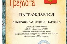 Учитель математики, Закирова Рамиля Ильдаровна, стала лауреатом муниципального этапа Всероссийского конкурса "Учитель года-2016" в номинации: "Шаг в науку". Молодец! Желаем дальнейших успехов!