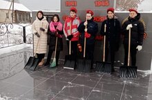 В школе прошла школьная акция "Защитим память героев". Ребята очистили от снега территорию памятника ветеранам ВОВ