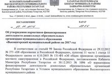 Постановление исполнительного комитета Высокогорского муниципального района "Об утверждении нормативов финансирования деятельности ДОО на 2017 г. 27.12.2016