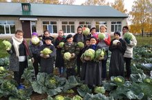 Учащиеся убирали капусту из огорода. Они любят щи, борщ и витаминный салат.