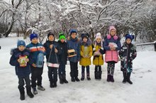 Башлангыч сыйныф укучылары үзләре ясаган җимлекләргә ярмалар салып аларны агачларга элделәр.