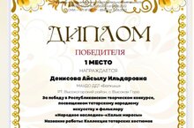 Поздравляем педагога ДДТ "Балкыш" Денисову Айсылу Ильдаровну с победой в Республиканском творческом конкурсе , посвященное татарскому народному искусству и фольклору "Народному наследию" - "Халык мирасы".