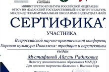 На базе детской музыкальной школы им. Дж.Файзи прошла всероссийская научно -практическая конференция "Хоровая культура Поволжья: традиции и перспективы развития", в которой Мустафина А.Р. получила сертификат участника.