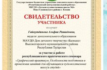 Гайнутдинова А.Р. - республиканский практический семинар для преподавателей дополнительного образования художественной направленности, учителей ИЗО/технологии/черчения в СОШ, педагогов изо-студий по теме: «Графический практикум. Особенности подготовки и проведения занятий для обучающихся художественных школ и студий», республиканский практический семинар «Современные подходы в организации учебного процесса через изобразительное и декоративно-прикладное искусство».