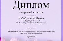 Рукодельницы Хабибуллина Диана и Мамзина Амалия из объединения "Кройка и шитье" (педагог Денисова А.И.) , стали лауреатами 1 степени во Всероссийском конкурсе изобразительного и декоративно-прикладного искусства "Цветы для мамочки" в номинации -поделка. Поздравляем !!!