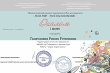 1 место заняла педагог по изобразительному искусству Галиуллина Рената Рустэмовна во Всероссийском конкурсе творческих работ для педагогов "Мой мир-мое вдохновение". Поздравляем!