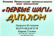 29 января в г.Набережные Челны прошёл Х Открытый региональный фестиваль-конкурс юных исполнителей "Первые шаги". Дом детского творчества представляли 6 юных вокалистов: Карева Ульяна, Шулаева Екатерина,Сабирова Дина,Губайдуллина Зарина ( руководитель Мустафина А.Р.) и Феофанова Амелия, Габдракипова Адиля ( руководитель Шарафутдинова Г.С.).Лауреатом 2 степени стала Карева Ульяна, остальные исполнители стали дипломантами конкурса.Поздравляем и желаем дальнейших успехов!
