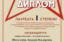 15 февраля отмечается 119 лет со дня рождения татарского поэта, Героя Советского Союза Мусы Джалиля. Наши юные мастера слова решили выразить почтение поэту, участием в IV Всероссийском онлайн конкурсе инсценировок по произведениям Мусы Джалиля и его соратников. Жюри по достоинству оценили наших воспитанников, наградив дипломами лауреатов 2 степени и лауреатом 1 степени самого педагога-Ибатуллину Л.И. Поздравляем!!!