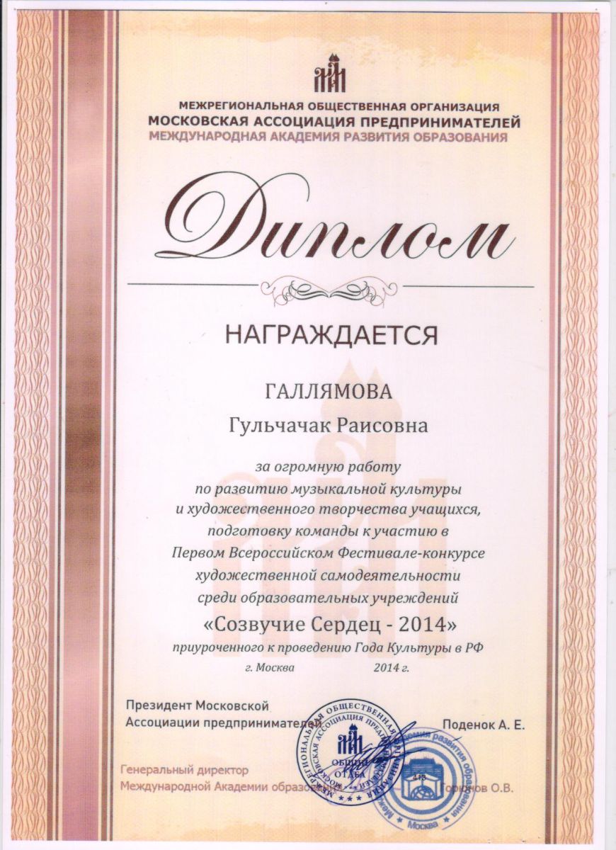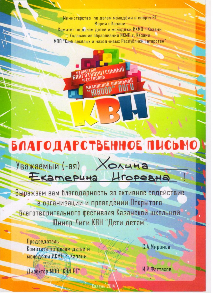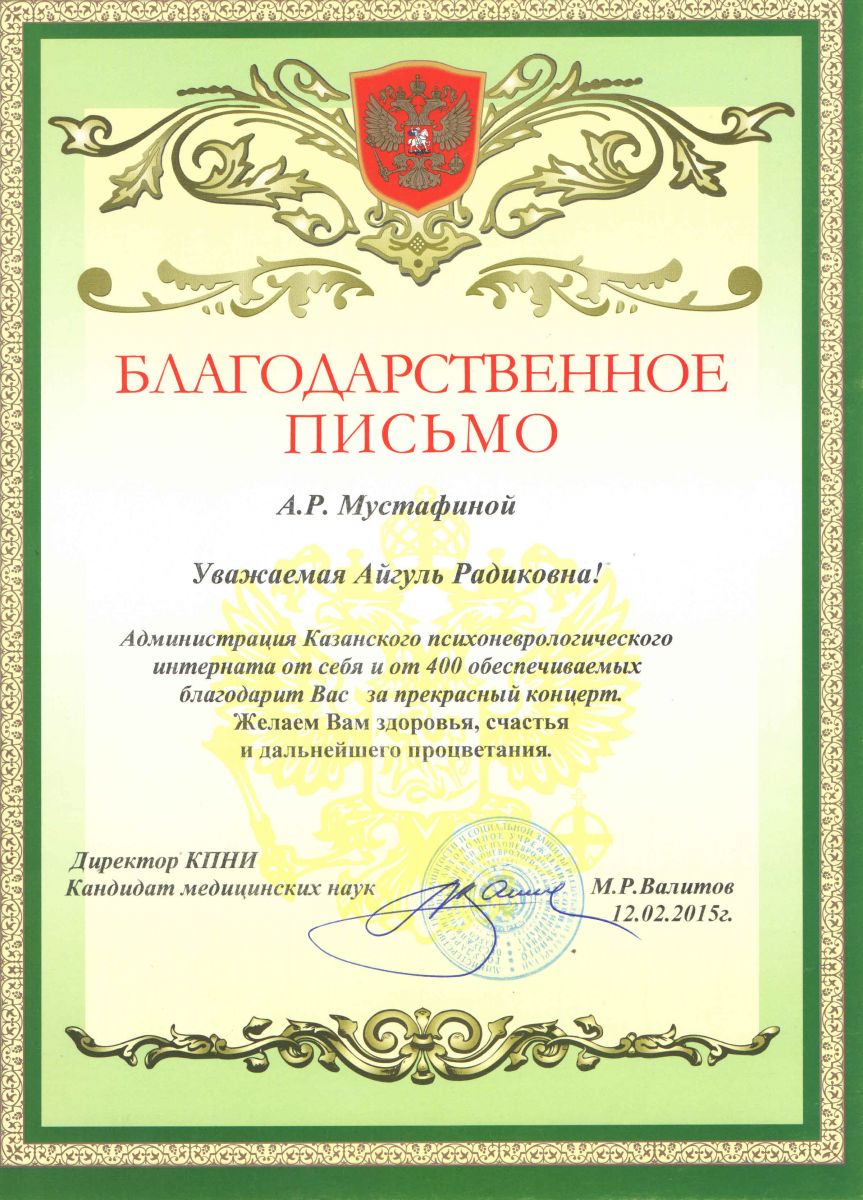 Благодарственное письмо Мустафиной Айгуль Радиковне