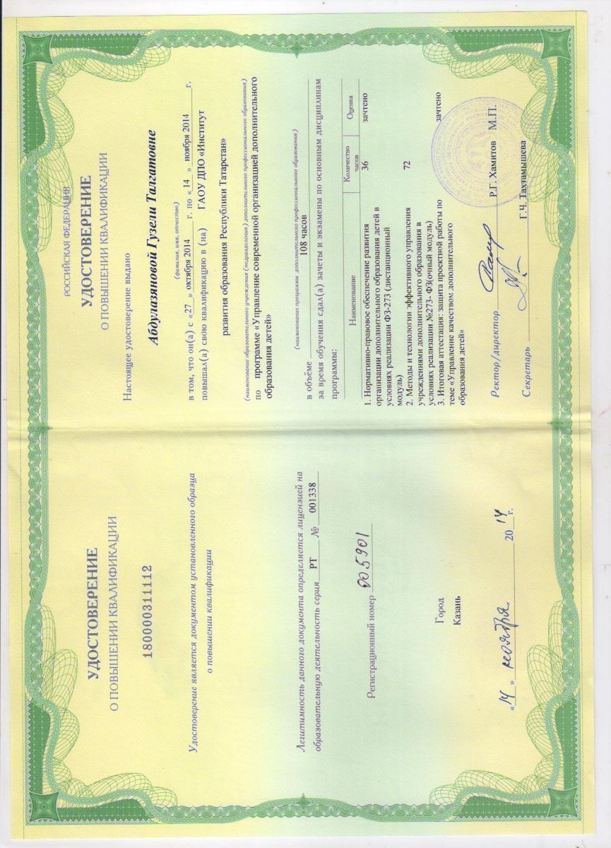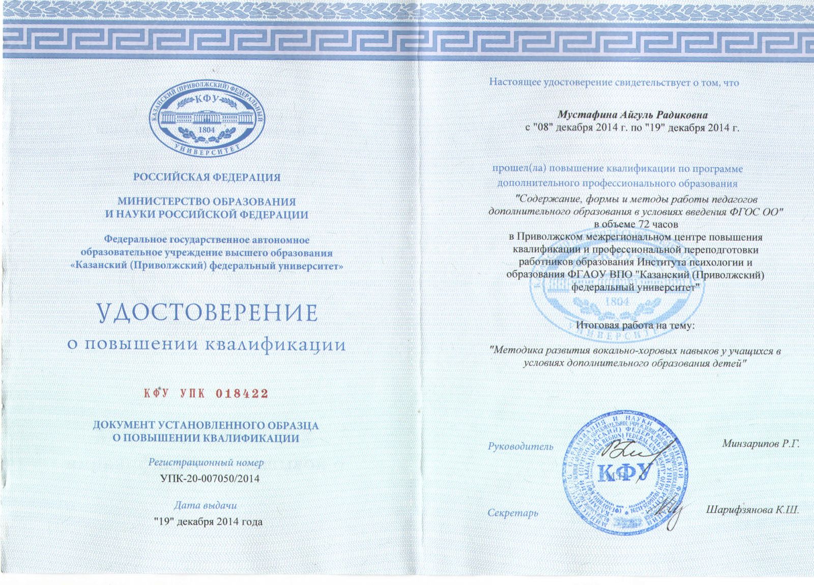 Удостоверение о повышении квалификации Мустафиной Айгуль Радиковны