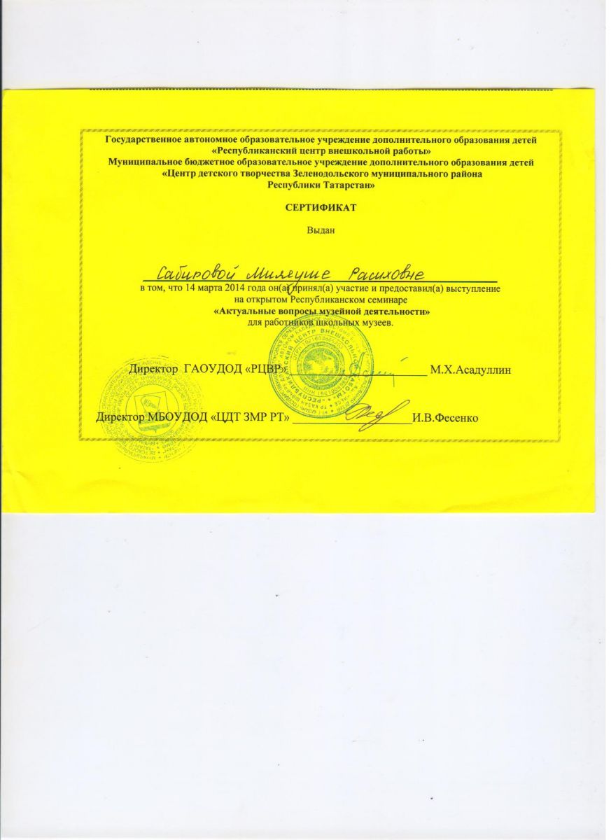 Сабирова Миляуша Расиховна - Республиканский семинар "Актуальные вопросы музейной деятельности"