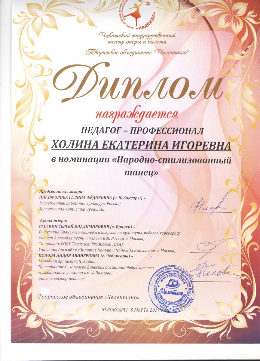 Холина Екатерина Игоревна- Всероссийский фестиваль-конкурс, диплом "Педагог-профессионал"