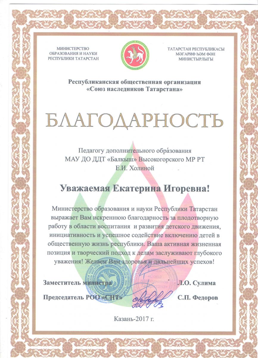 Холина Екатерина Игоревна - Благодарственное письмо Министерства образования и науки РТ,2017