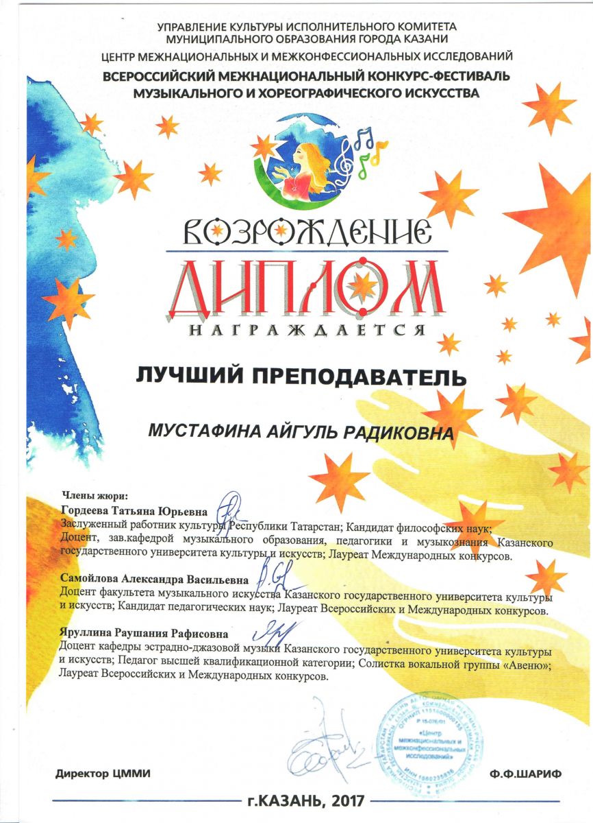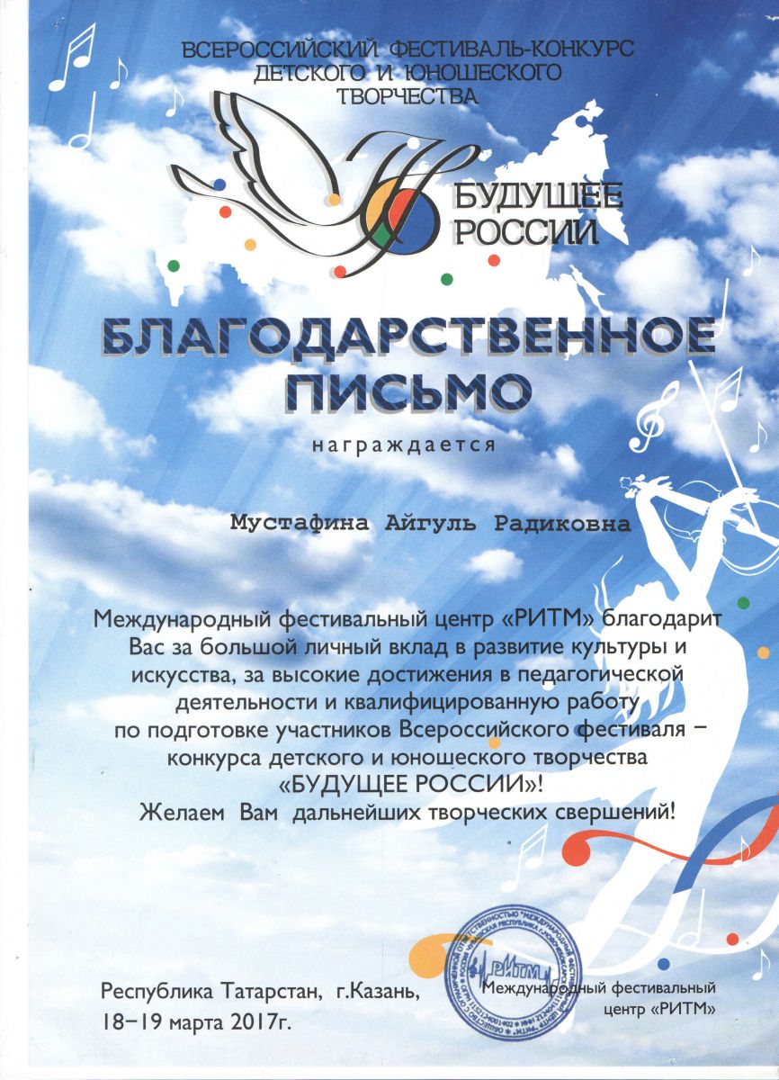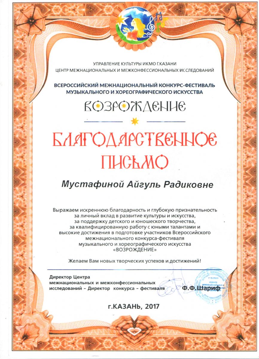 Мустафина Айгуль Радиковна - Региональный фестиваль "Илхам-Вдохновение", благодарственное письмо