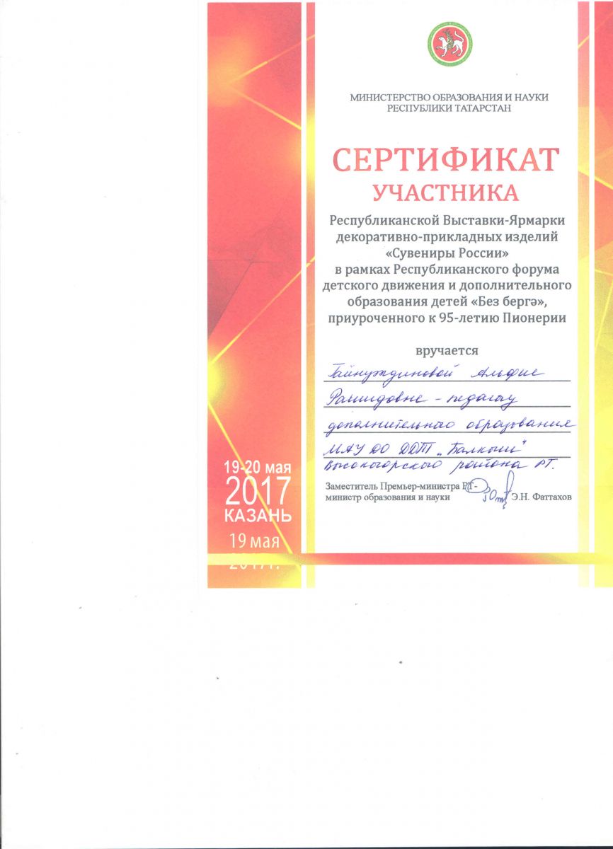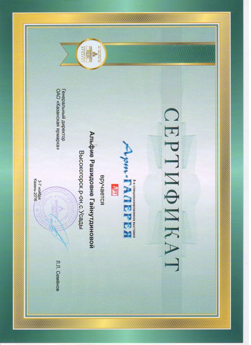 Республиканская выставка "Арт-галерея", сертификат - Гайнутдинова А.Р.