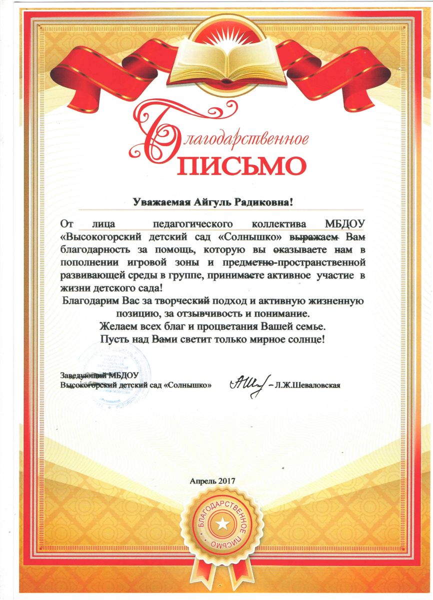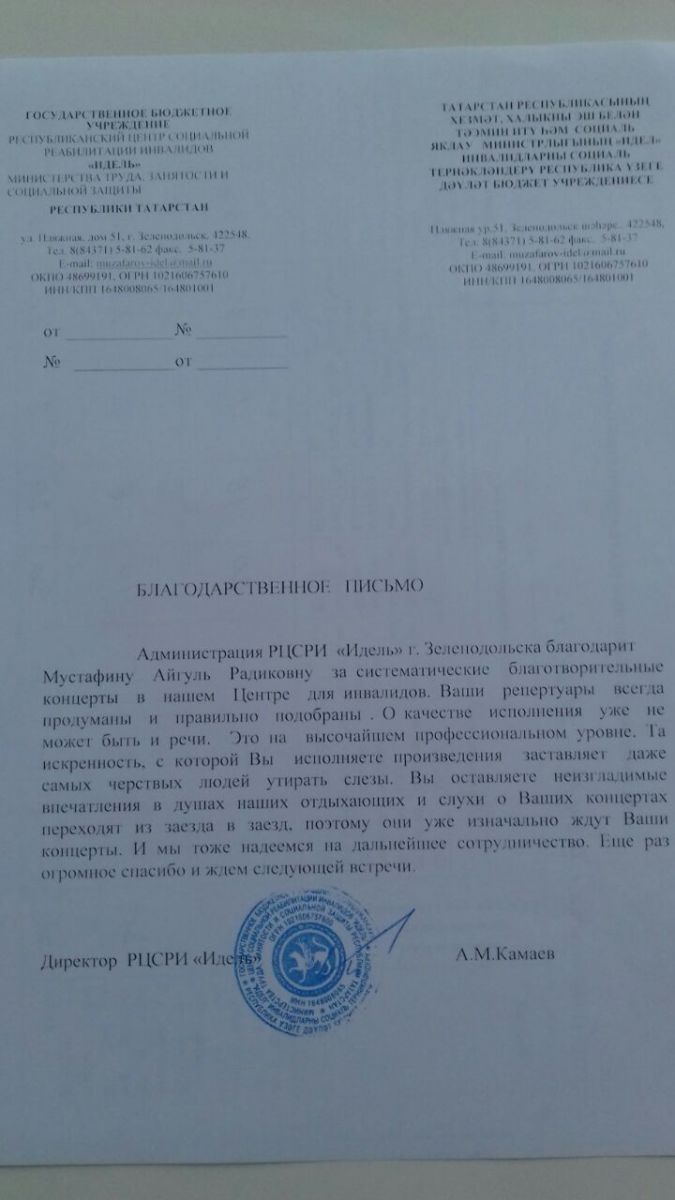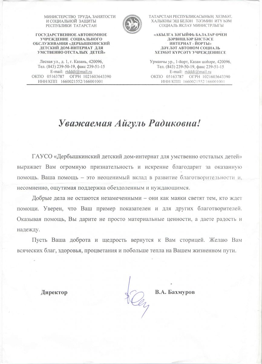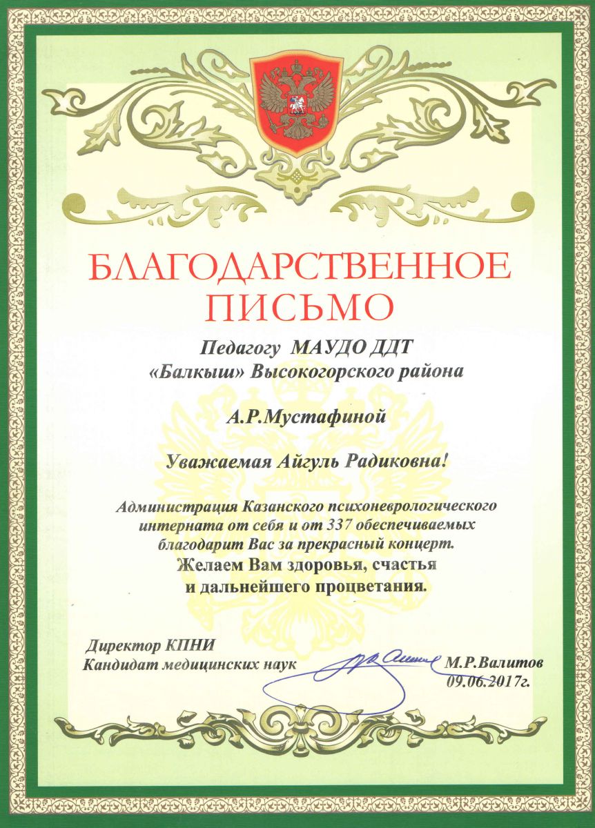 Мустафина Айгуль Радиковна -Благодарственное письмо Казанский психоневрологический интернат.