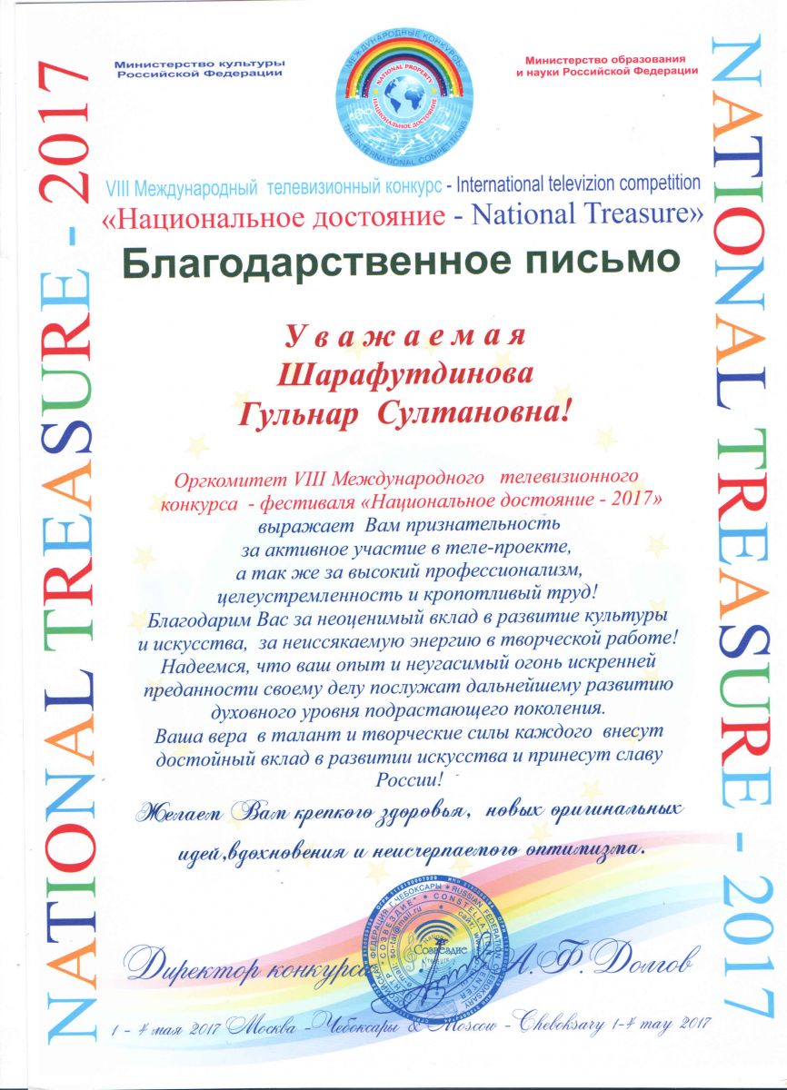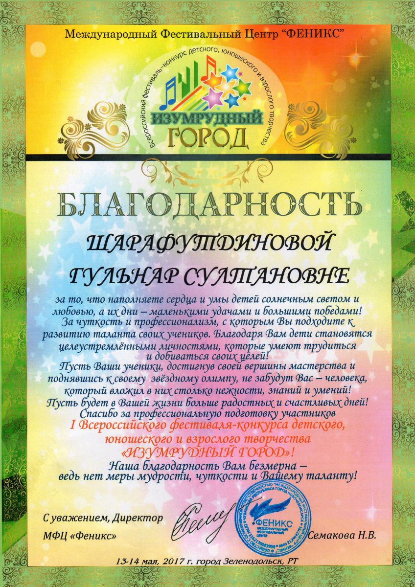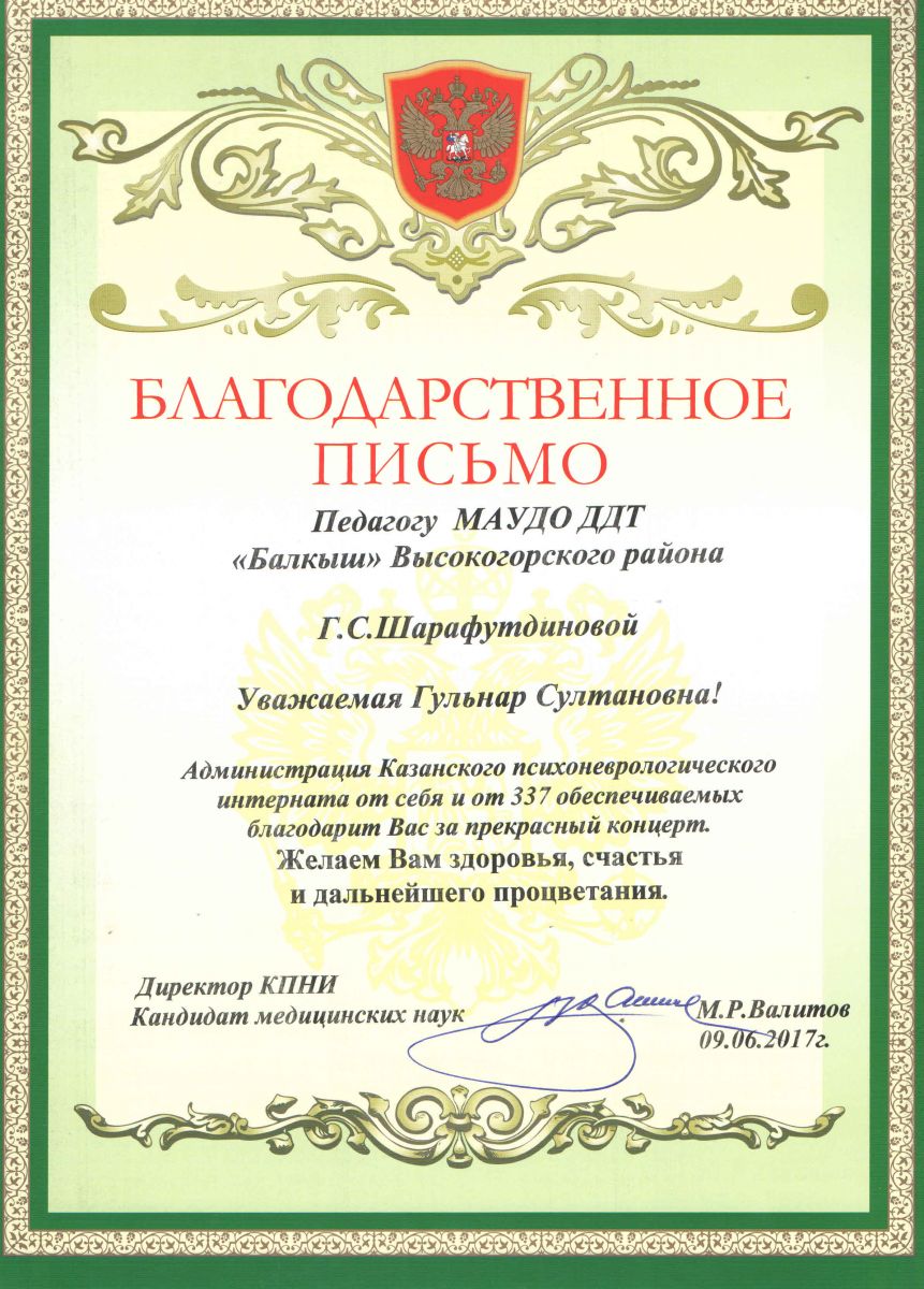 Шарафутдинова Гульнар Султановна - Благодарственное письмо . Казанский психоневрологический интернат