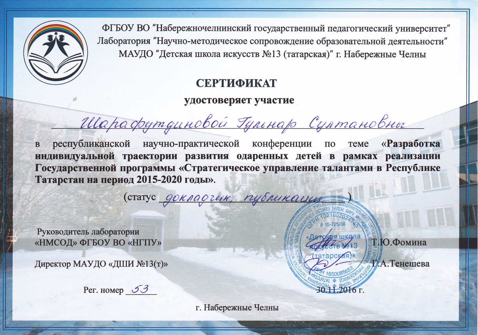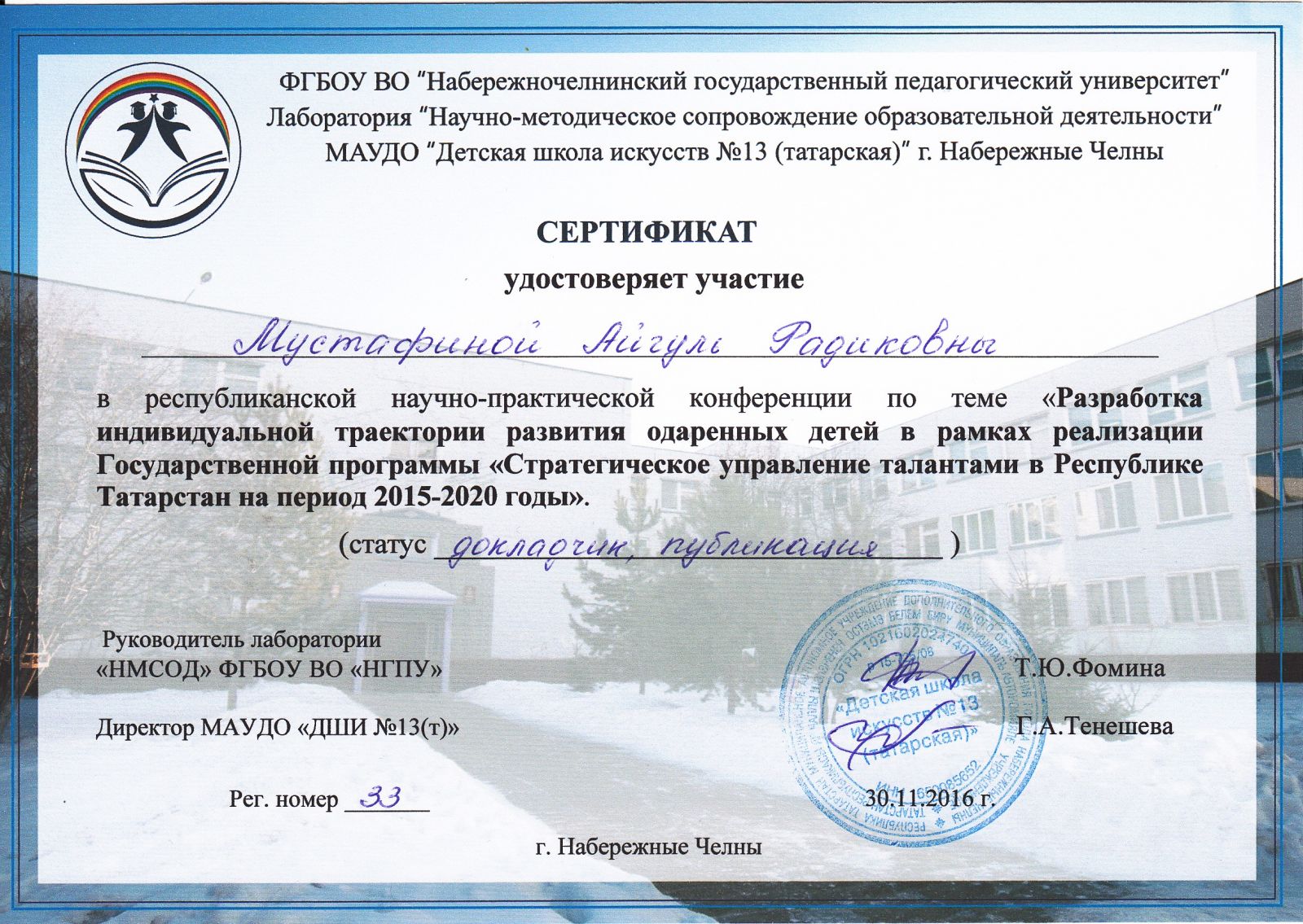 Мустафина Айгуль Радиковна - Республиканская научно-практическая конференция "Разработка индивидуальной траектории развития одаренных детей в рамках реализации Государственной программы "Стратегическое управление талантами в Республике Татарстан на период 2015-2020 годы"