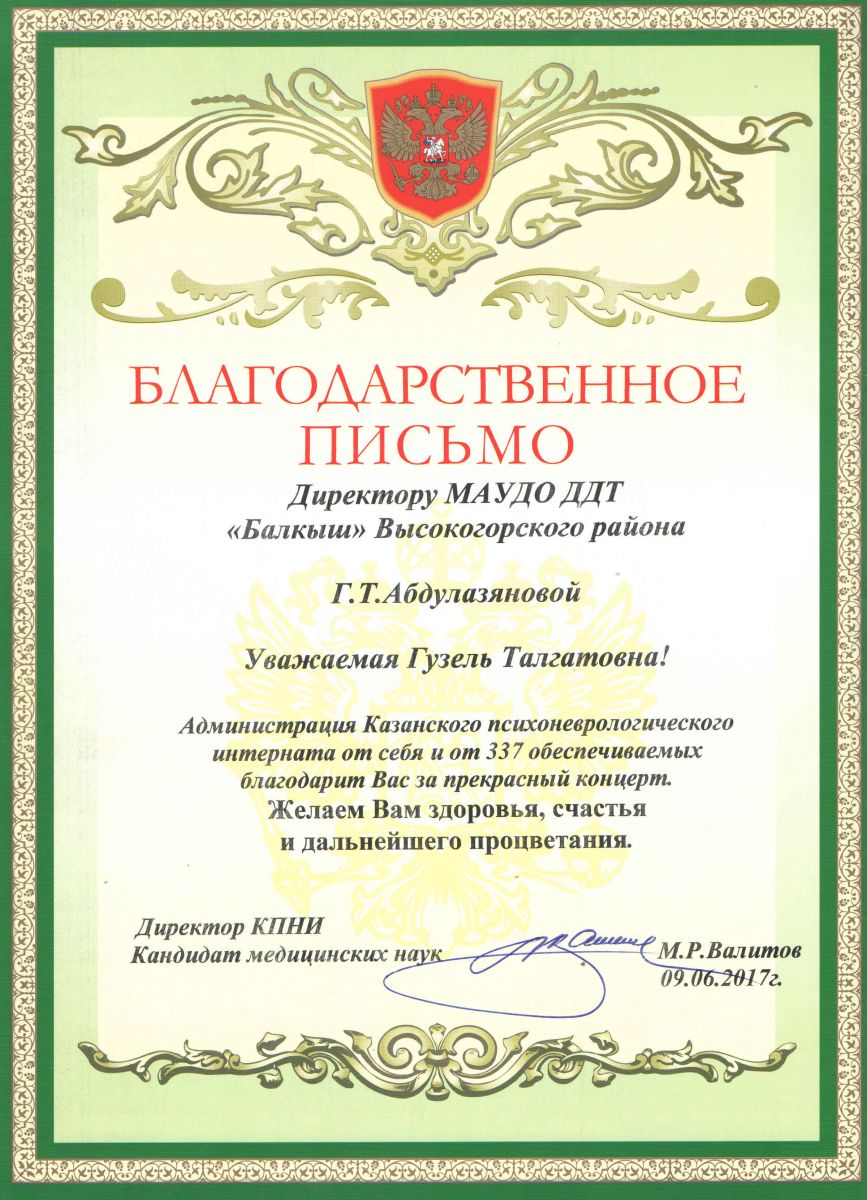 Абдулазянова Гузель Талгатовна - Благодарственное письмо. Казанский психоневрологический интернат