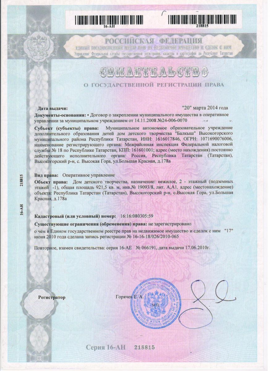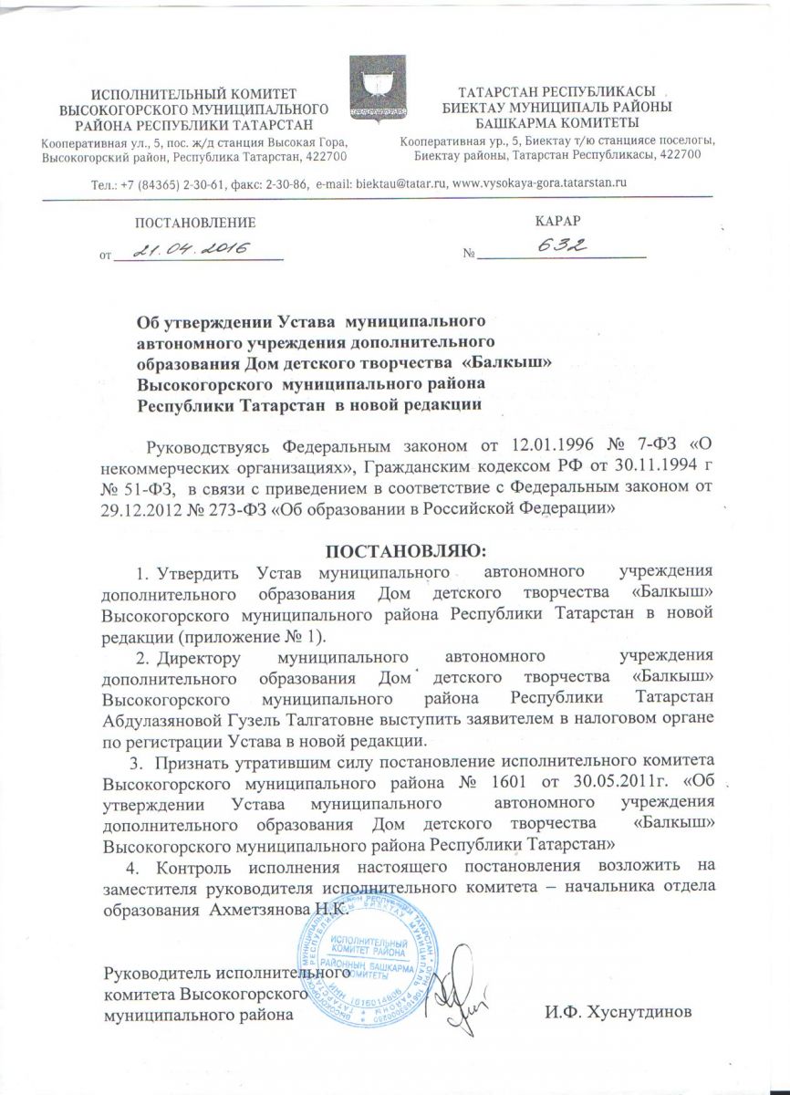Постановление Исполкома Высокогорского муниципального района РТ о создании МАОУДОД ДДТ Балкыш