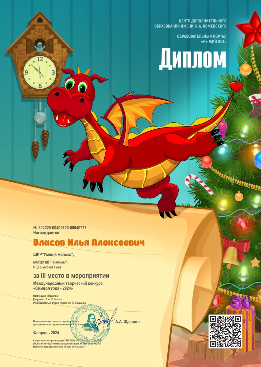 Международный творческий конкурс "Символ года-2024" - Власов Илья, 3 место