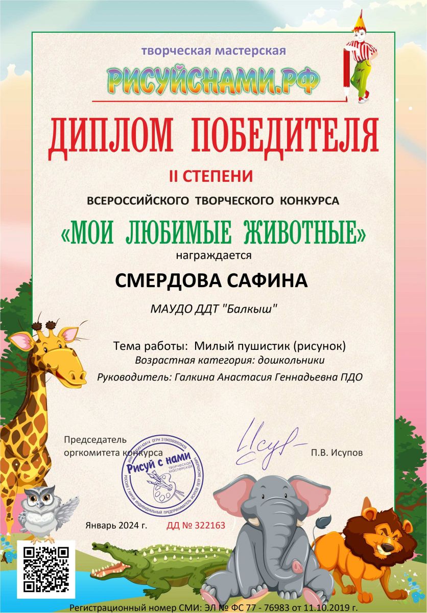 Всероссийский творческий конкурс "Мои любимые животные" - Смердова Сафина, 2 место