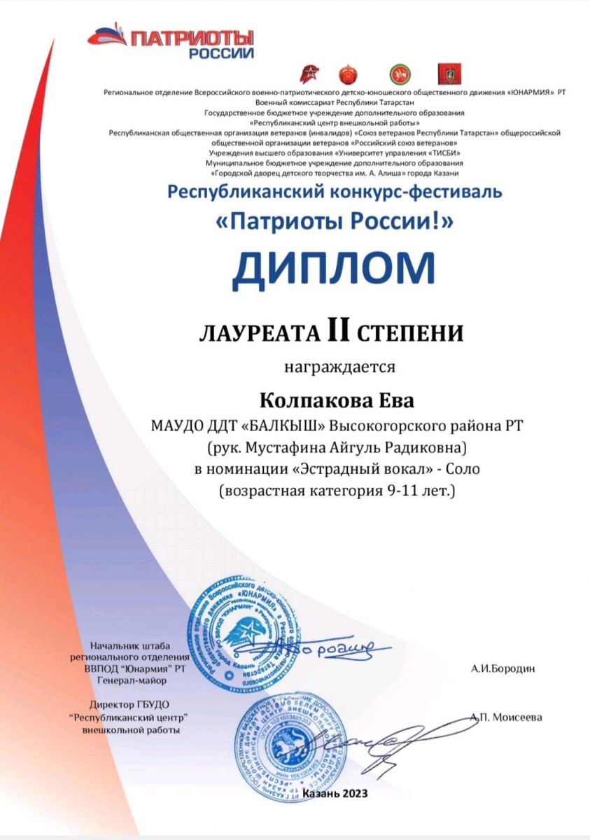 Республиканский конкурс-фестиваль "Патриоты России" - Колпакова Ева, лауреат 2 степени
