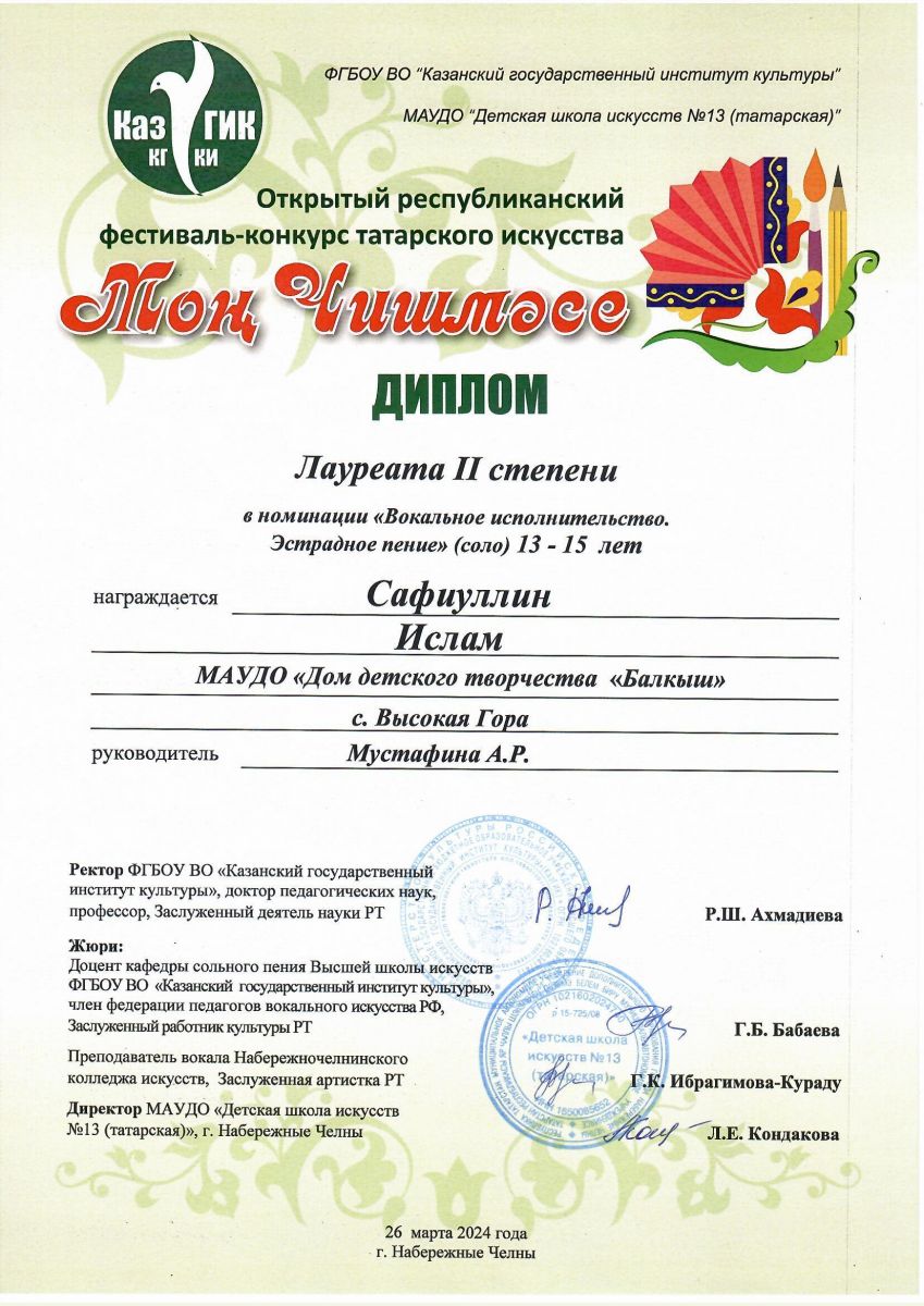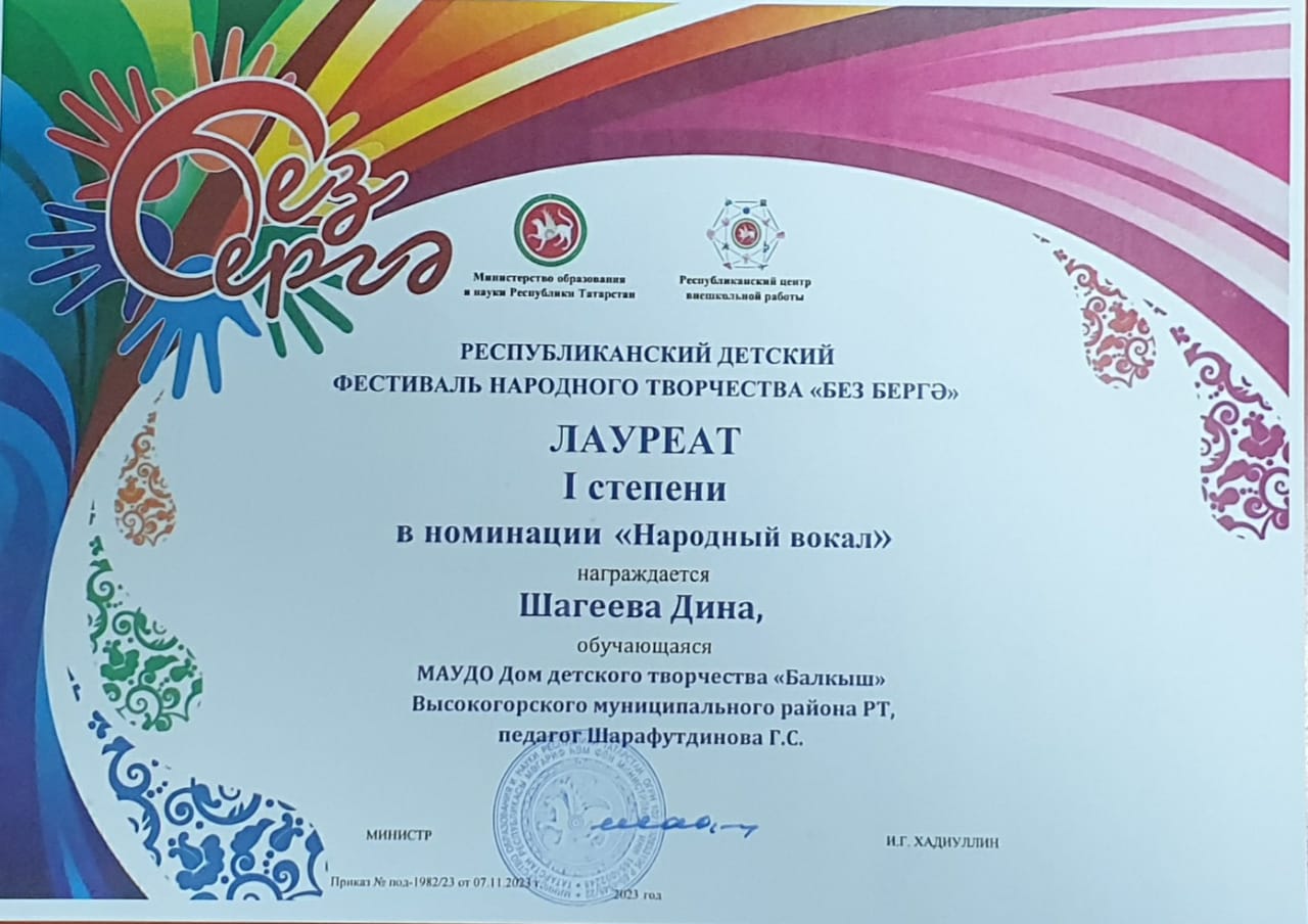 Республиканский детский фестиваль народного творчества "Без бергэ" - Шагеева Дина, лауреат 1 степени