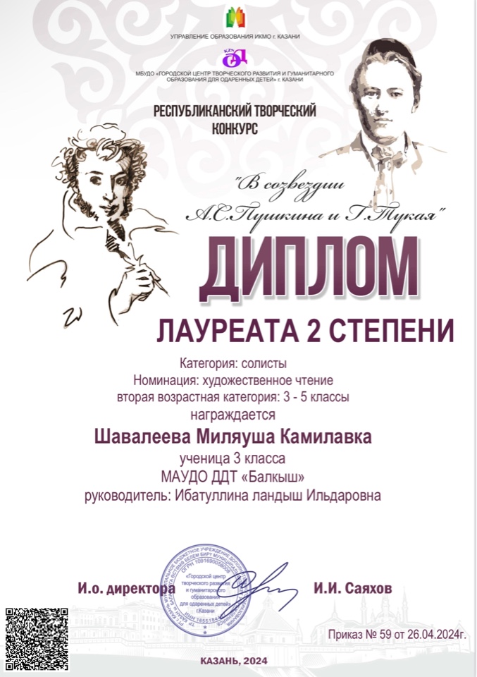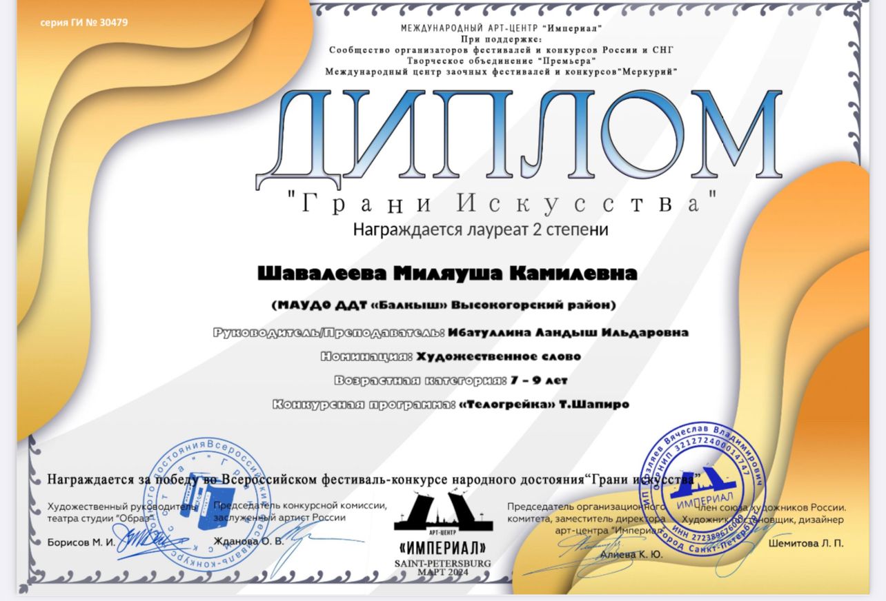 X Всероссийский фестиваль-конкурс "Великая Победа - 2024"- Шавалеева Миляуша, лауреат 1 степени