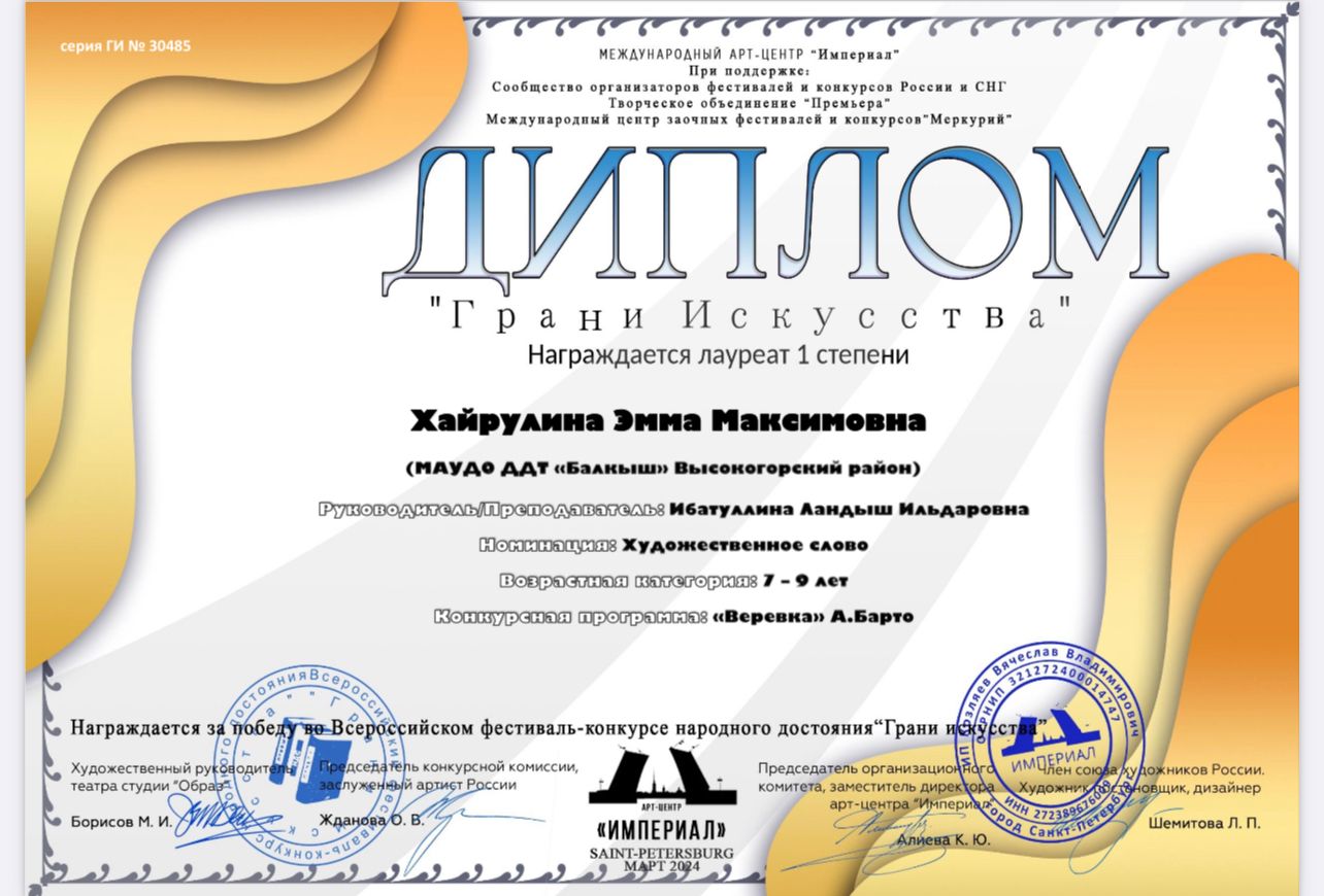 X Всероссийский фестиваль-конкурс "Великая Победа - 2024"- Хайруллина Эмма , лауреат 1 степени