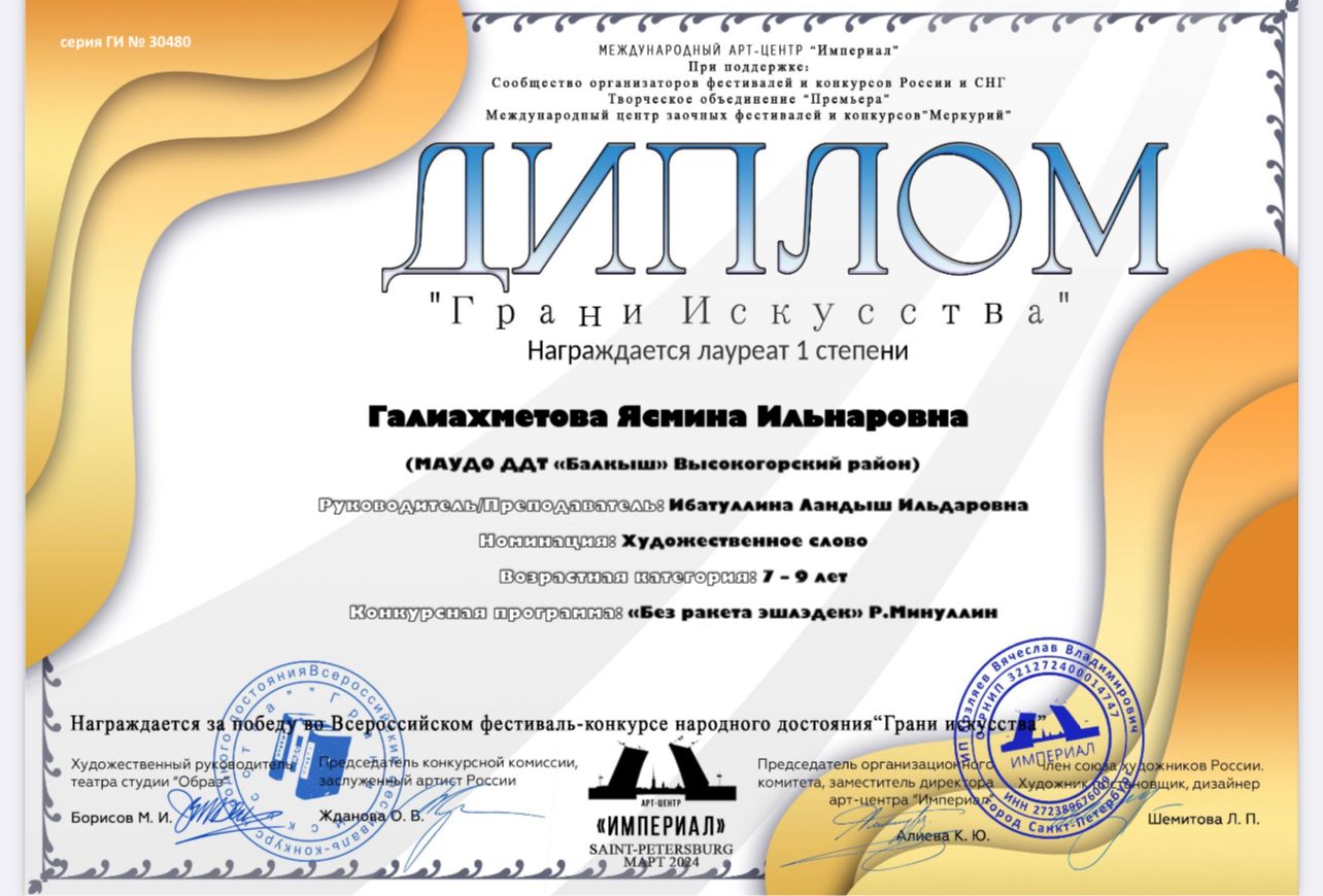 X Всероссийский фестиваль-конкурс "Великая Победа - 2024"- Галиахметова Ясмина , лауреат 1 степени