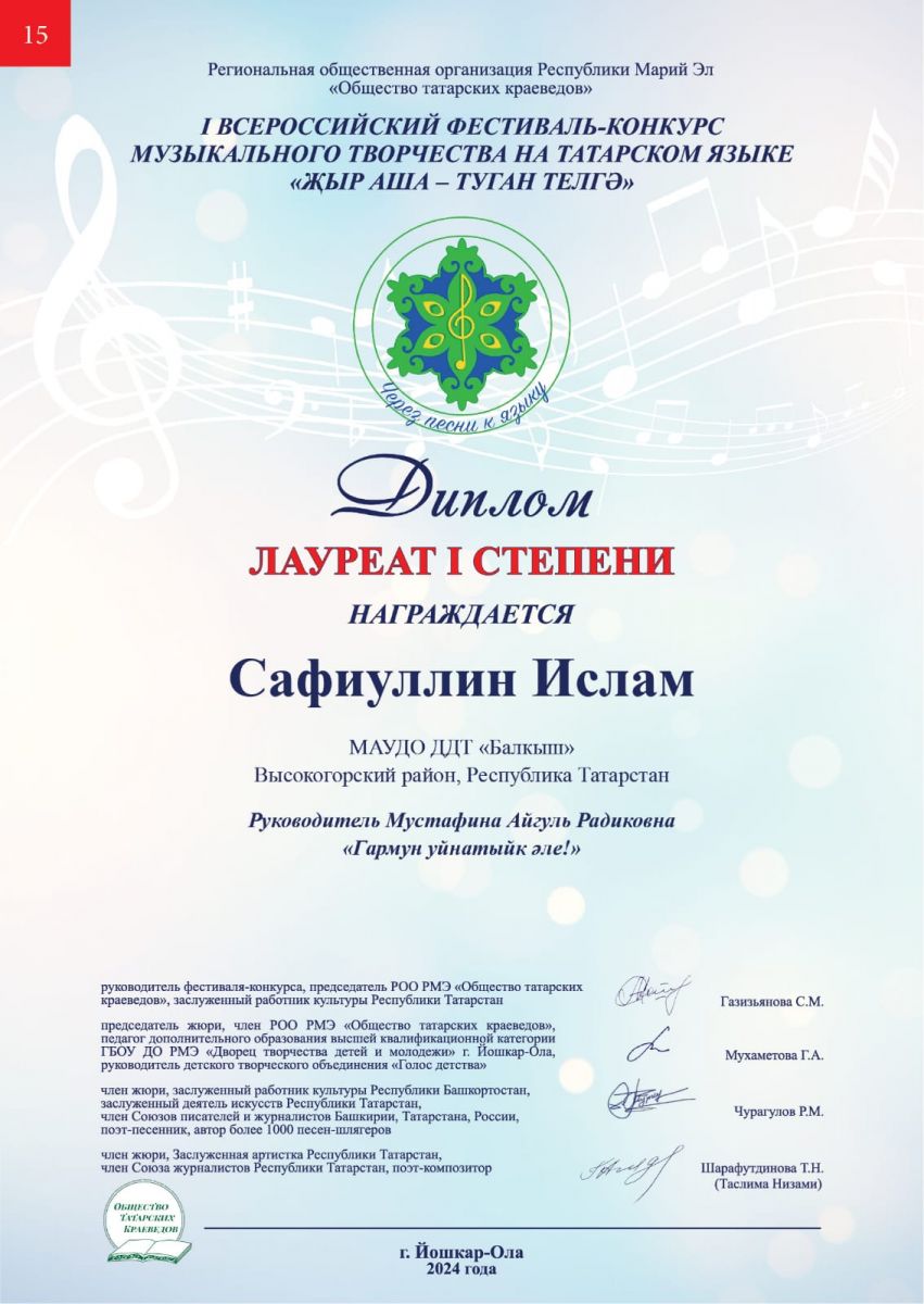 Международный конкурс "Таланты России" - Набиуллин Сабир , лауреат 1 степени