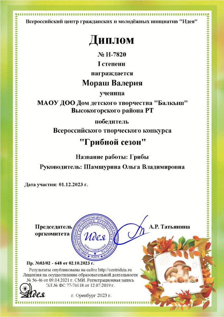 Всероссийский творческий конкурс "Грибной сезон" - Мораш Валерия, 1 место