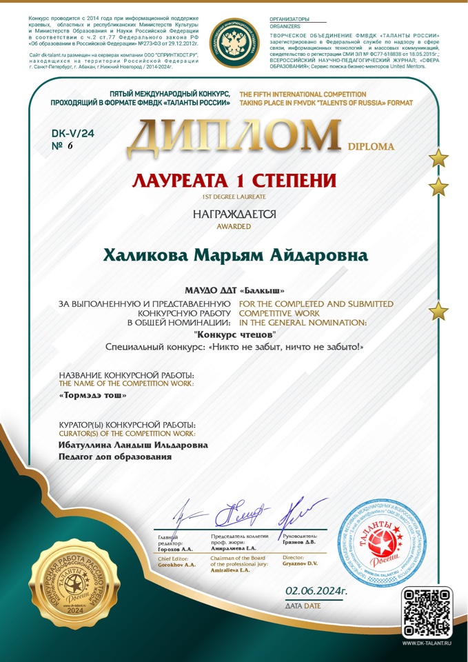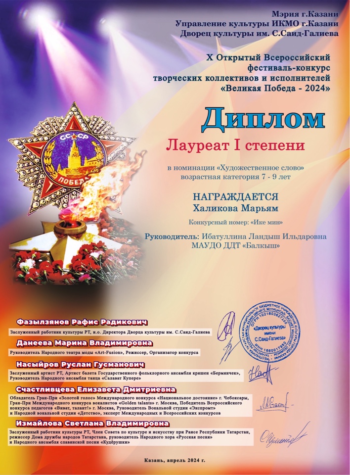 X Всероссийский фестиваль-конкурс "Великая Победа - 2024"- Халикова Марьям, лауреат 1 степени