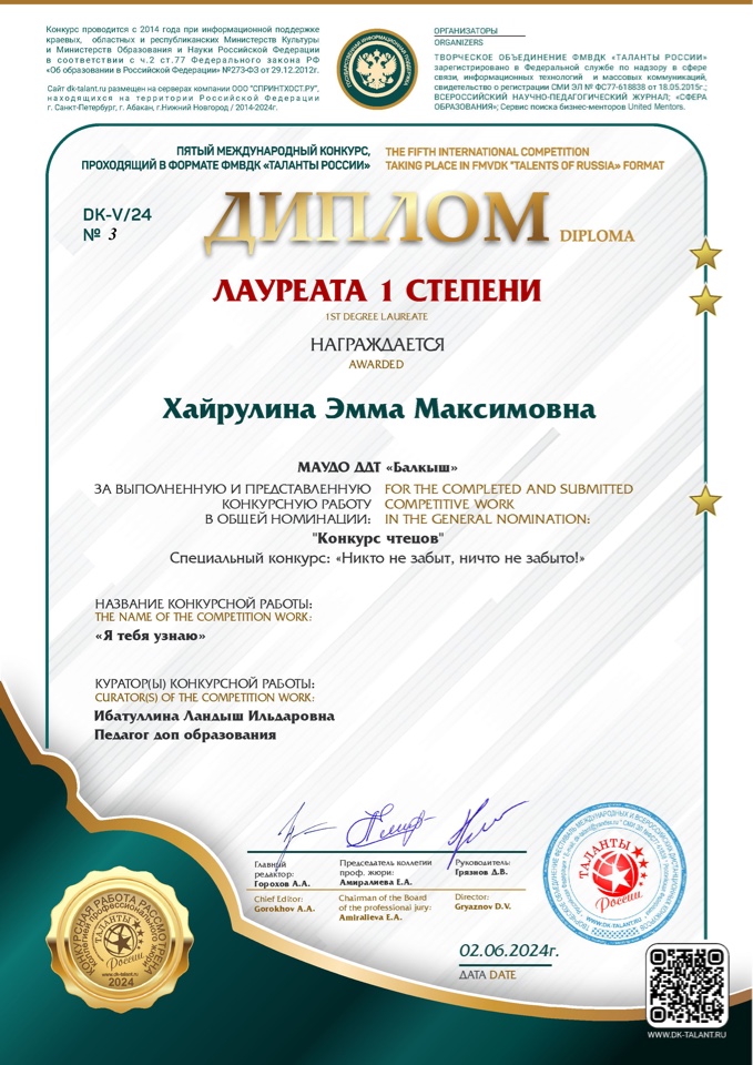 Международный конкурс "Таланты России" - Хайруллина Эмма , лауреат 1 степени