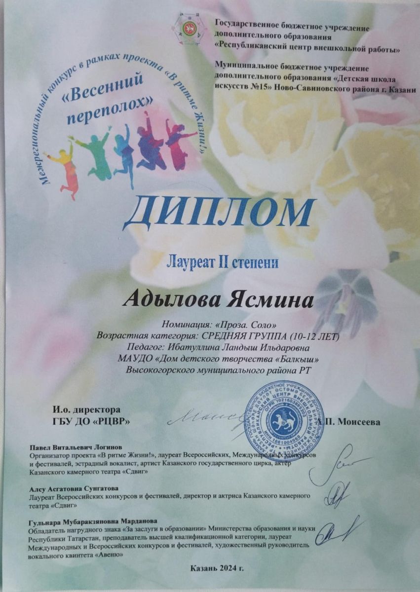 Межрегиональный конкурс "Весенний переполох" - Адылова Ясмина, лауреат 2 степени