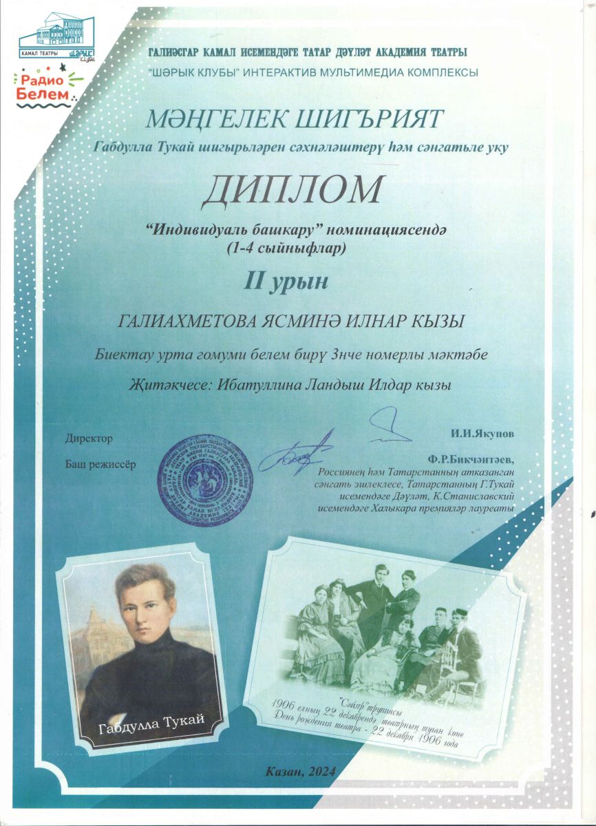 Республиканский конкурс "Мэнгелек шигырьият"- Галиахметова Ясмина, 2 место