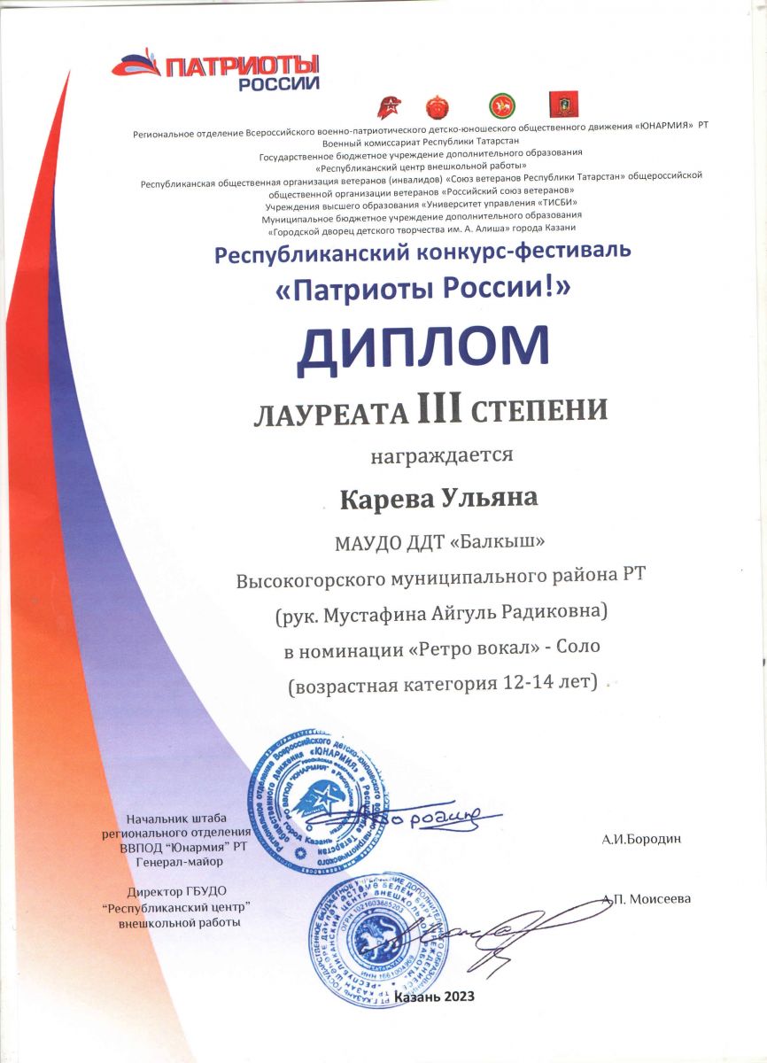 Республиканский конкурс-фестиваль "Патриоты России" - Карева Ульяна, лауреат 3 степени