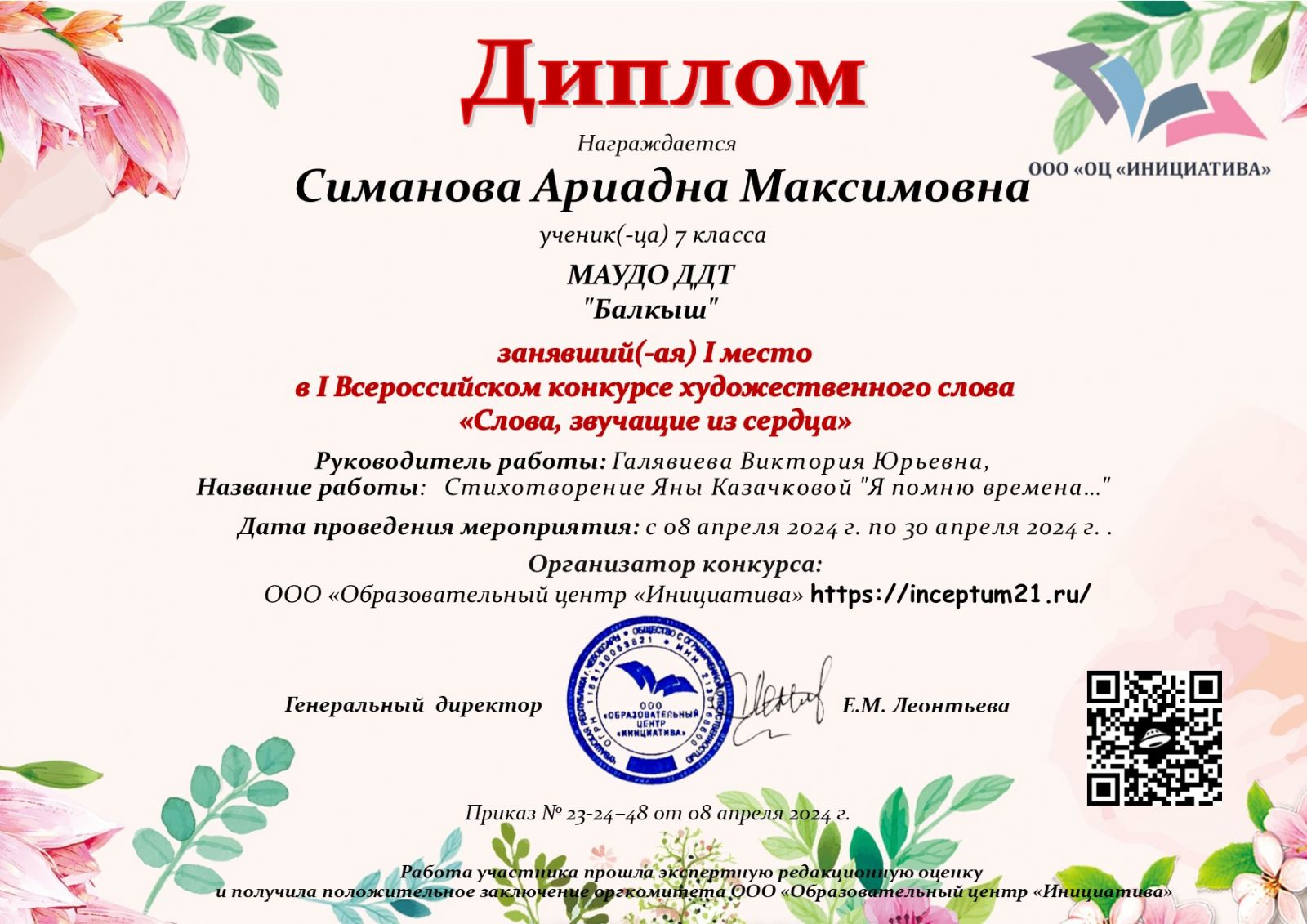I Всероссийский конкурс художественного слова "Слова, звучащие из сердца"- Симанова Ариадна, 1 место