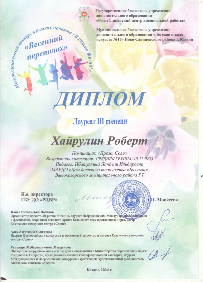 Межрегиональный конкурс "Весенний переполох" - Хайруллина Роберт, лауреат 3 степени